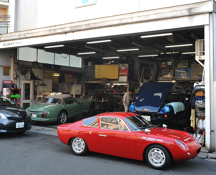 TVRを始め外車のメンテがメインだそうです。赤いフィアット・アバルト・ビアルベーロ(1963)は崎山さんの「アシ車」! 相当貴重なクルマらしいのですが~(すいません、私、疎いのでよく知らないのです)