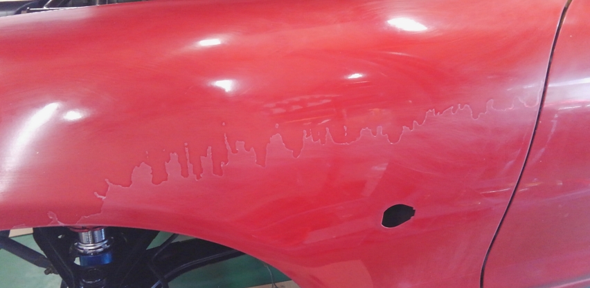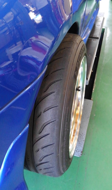 私のホイルを試し履き。ノーマルフェンダで8Jマイナス28だとこんなにはみ出るのね(笑)