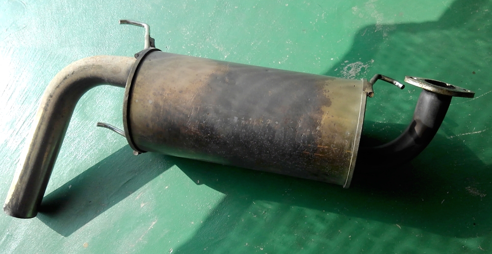 これは「DKマフラー」です、知ってる人は知ってるよね。静かな方のタイプですが……装着していたオーナーさんにとってはちょっと音量が大きかったようで……当店の純正改マフラーを装着したのです。