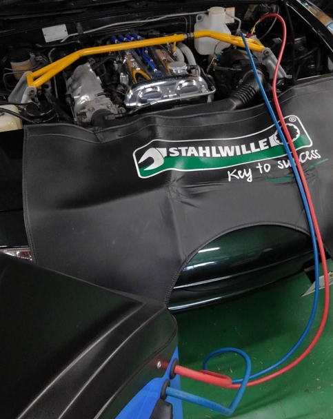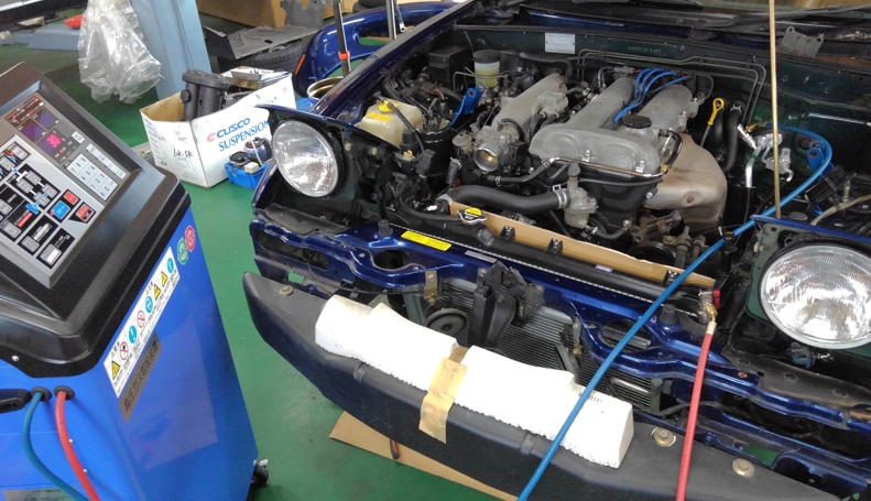 幌交換のNA、エアコンガスのメンテも。まずは既存のガスを抜きます。