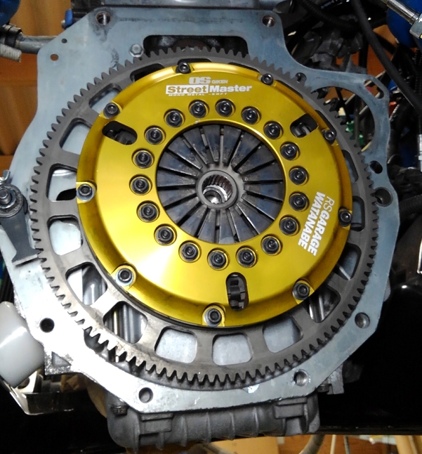 そしてクラッチを装着! 当店オリジナル企画のOS技研製のクラッチです。ハンクラが使えるメタルクラッチです。見てのとおりコンパクトなサイズです、重さのマスを中心に集めた!と言う感じ。NAチューンドなら全然問題ないですね。ハイパワーターボ車で使えるかどうかは不明です、何せデータが無いので。ただOSさんのサイトによるとこのタイプでも380馬力まだ対応らしいのでロドスタなら十分じゃないかと。そんなにパワーあるロドスタいないでしょ(笑)