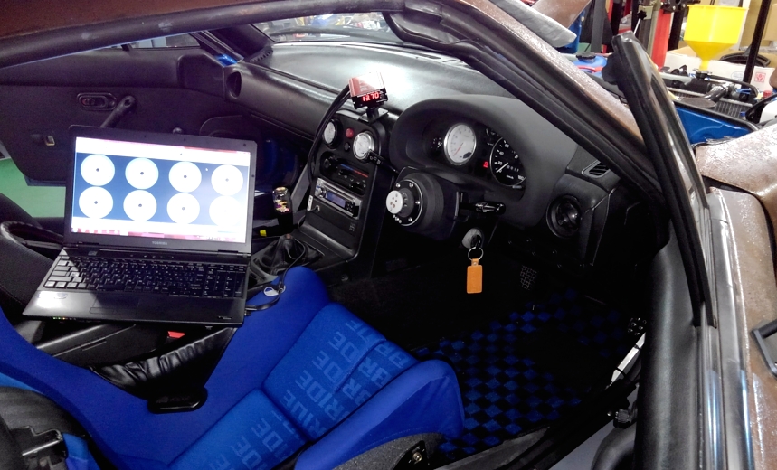 パソコンつないで始動時の燃料の項目をパチパチと……良いか悪いかはすぐに答えが出るので便利です。私の場合、とりあえず掛かればOKなので多少の事は目をつぶります、時間が余ればもっと煮詰めます。とりあえず走れればOK~ 動かせるようになれば後は何とかなります、フルコンは動かすまでが大変なんですよ。