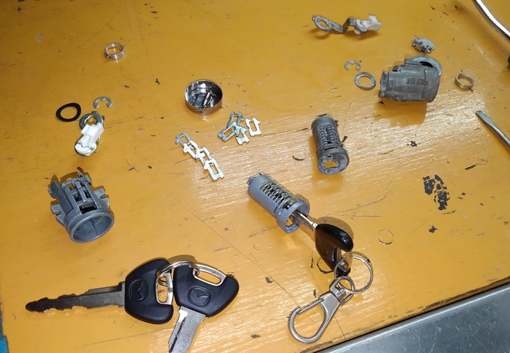そのクルマのキーシリンダのメンテ。新品を1つ取り寄せて「キーのプレート」以外を交換中です。こうすれば元の鍵が使えますので。破損していて運転席の外から開かなかったんですよ(苦笑) いつも助手席からドアを開けるという……