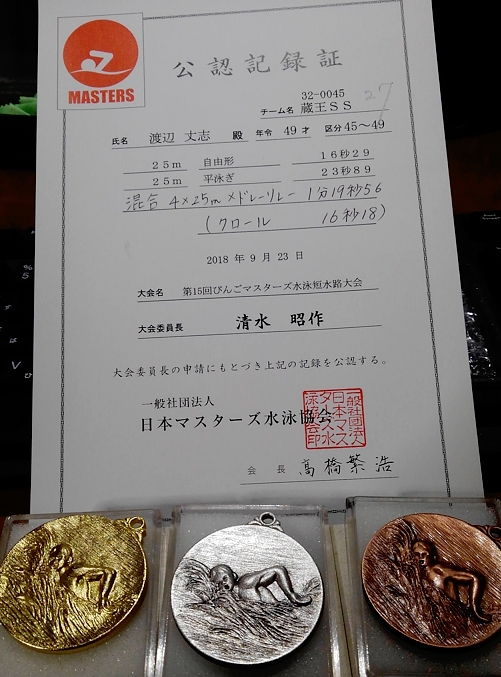 年齢区分で45~49歳のクラスなんですが自由形はエントリー3人(笑)で、2番だったので銀メダル。平泳ぎも3人でした、3番なので銅メダル。混合メドレーは4人の年齢の合計でクラスが分かれます。私たち4人のクラスは2組(笑) もう1組に勝ったので1番です!金メダルゲット!!結構接戦だったんじゃないかなぁ~ これは盛り上がりましたし、私がラスト泳者だったので緊張しました。