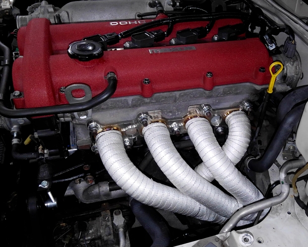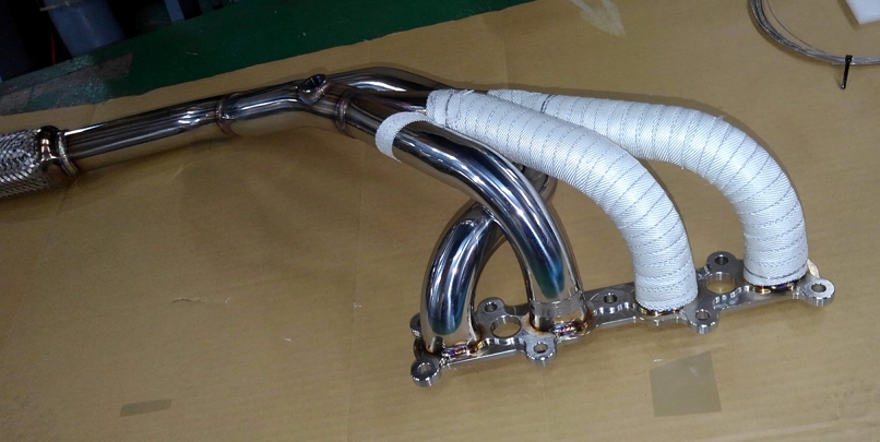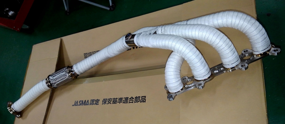 NA8用の新品マキシムエキマニにバンテージを巻きます。バンテージを巻くか巻かないかはオーナーさんの考えでOKです。