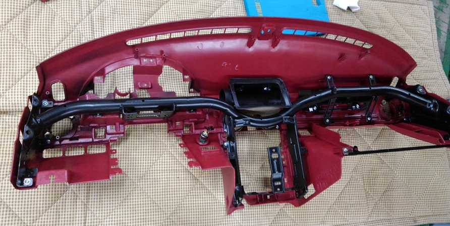 ダッシュボードを交換しますがその前にひと手間を。いわゆる「骨」ですがご覧のように薄っすらと錆が出ます、皆さんのクルマのも出てます。まぁ特に不具合はありませんので通常はこのまま組み直します、組めば全く見えないパーツですしね。