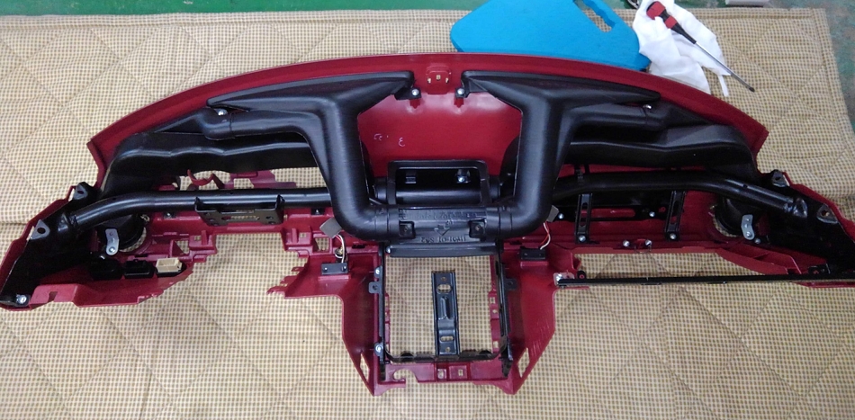 右が新品です、全然違うでしょ。このユニットで2.5万くらい、ダッシュ降ろすので結構な工賃掛かりますし、通常ダッシュも交換します。黒いダッシュで一通り部品交換すれば20万くらい掛かります。タンや赤ならもっとね(微笑)