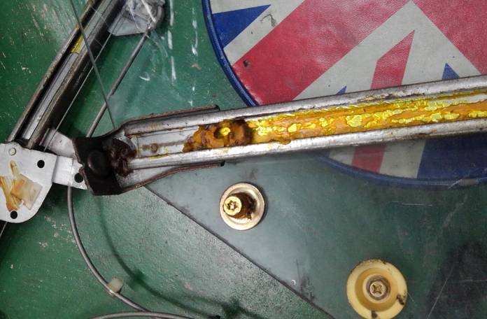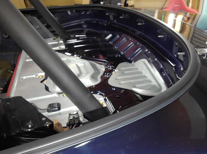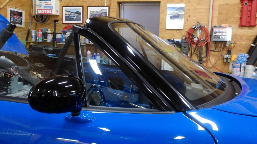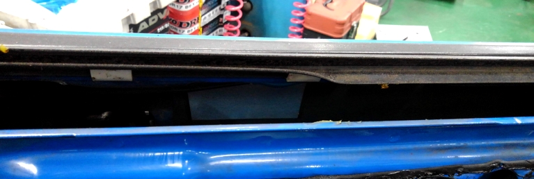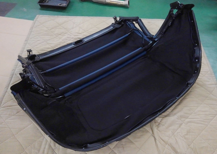 ロールバー付きなのでメインアーチを外して幌を外します、ベルトラインモールも交換するので取り外し、その図です。ねちゃねちゃしてますのでお掃除します、これが結構大変なのよ。