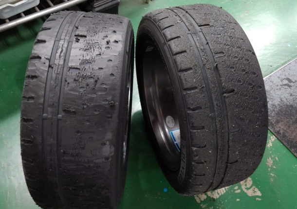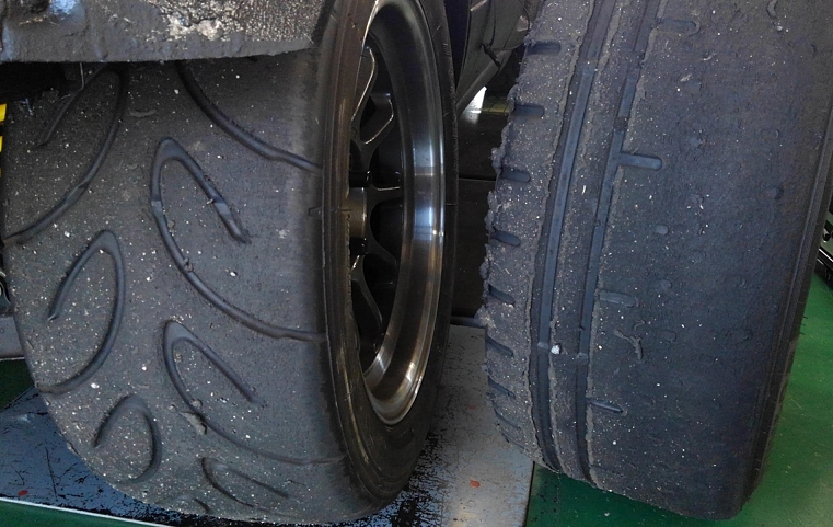 タイヤはβ02を電動カンナで一皮むいた状態です、積載車で来ているので転がしていないです、これは積載車のメリットですね。走行したのは朝の1枠のみですがアタック2周までは凄く良い感じでした。3周目で一気にダメになりましたけどね(笑) なので「まだ生きてるタイヤ」だと思います。