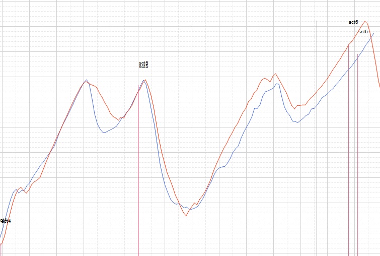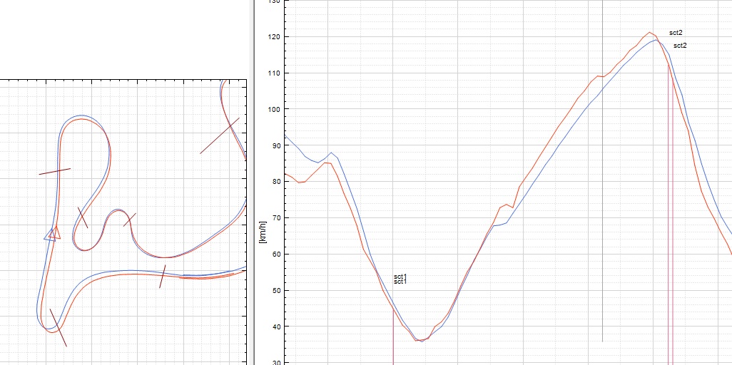 図はいわゆる2コーナーから3コーナーへのストレート。青線は2速9000回転以上回してます。赤の今回は8500でシフトアップ。加速は明らかに今回の方が良いですね、軽さが効いてるってことでしょう。