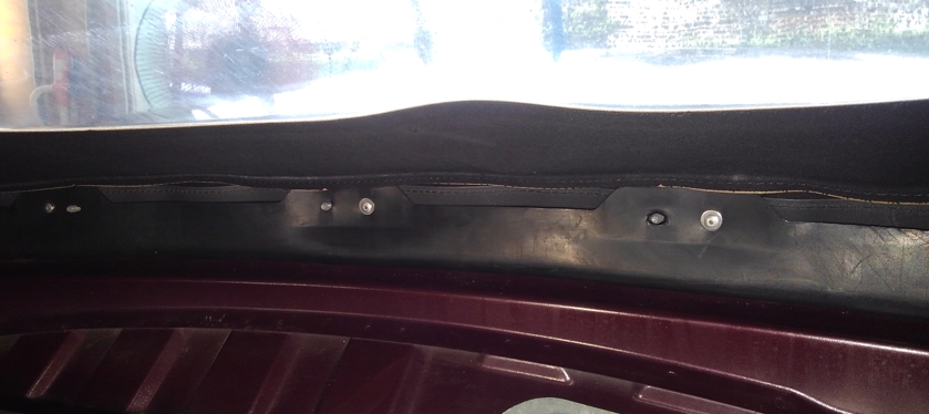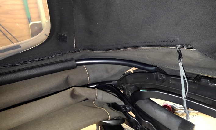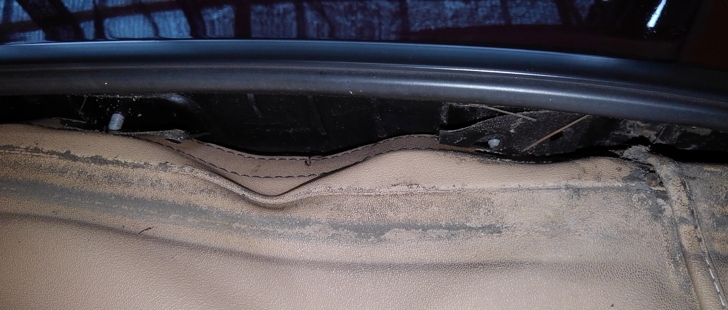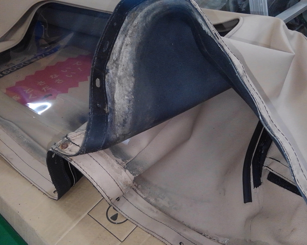 幌の内側ですが生地の色が違うでしょ?これ、いわゆるスクリーンだけ交換しているんです。おそらく車上でね。で、レインレールと幌の接合が「めんどくさかった」んでしょう(笑) 車上じゃ無理だしね!