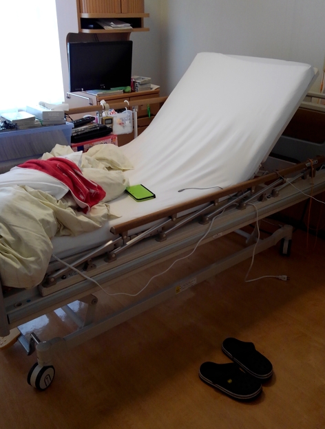 車椅子に乗れるようになり病院内をウロウロしてるようです、売店がお気に入り(笑) 大げさなカバーが付いていますがもう立てます、リハビリでは歩行訓練中で12日退院は決定とのこと。