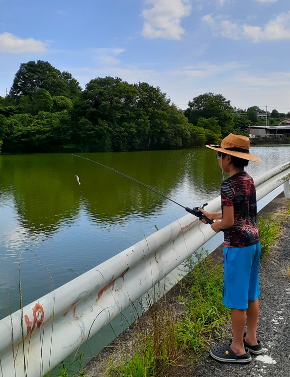 帰宅後、長男坊と久しぶりに町内の池へ釣りに行ったんです、メガネ無でね。良く見えるから楽しいなぁ~と思いつつ。フネも出して。