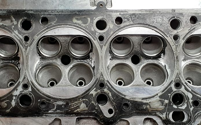 最初にマーキングしたラインでは削り込みましたが……ガスケットを合わせるとまだ甘いんです。そこでガスケットの上から軽く黒のスプレーを吹いて削り残しているところを確認します。