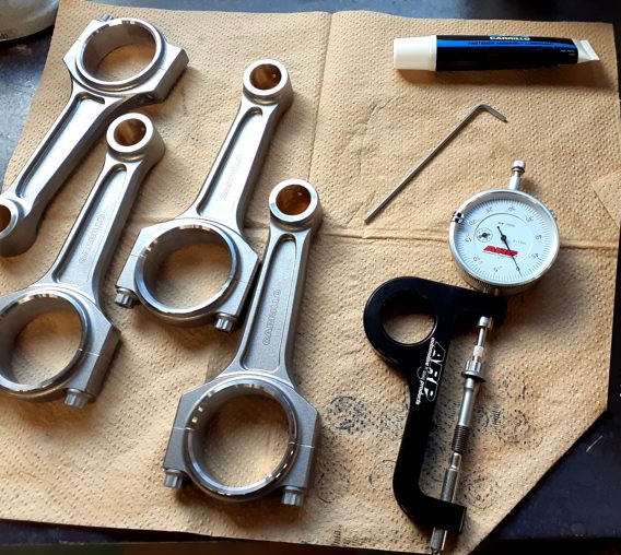 コンロッドはキャレロ製です、超軽量なんですよ~ ちなみにボルトはARP製です。右の工具はボルトの伸びを計測するものです、こんだけで3万くらいします(微笑)