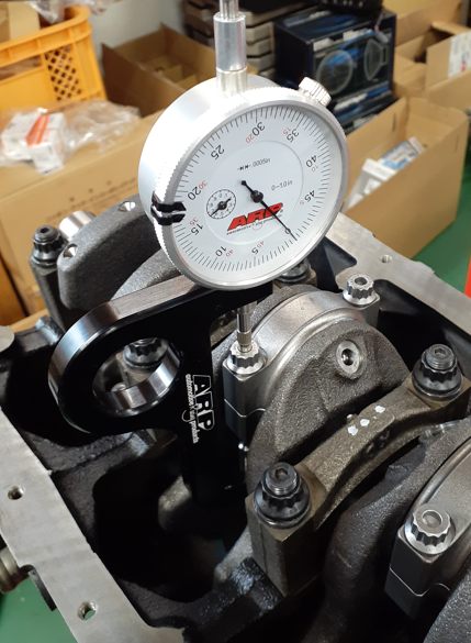 これが締めた後。インチ表示なのですが……0.004-0.006の間が適正値。エンジンに組む前にコンロッド単体で計測しています、どのくらい締めたらどのくらい伸びるのかは。