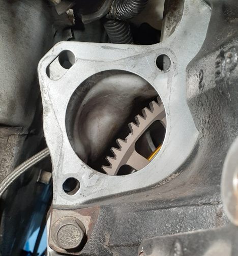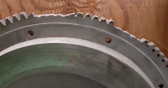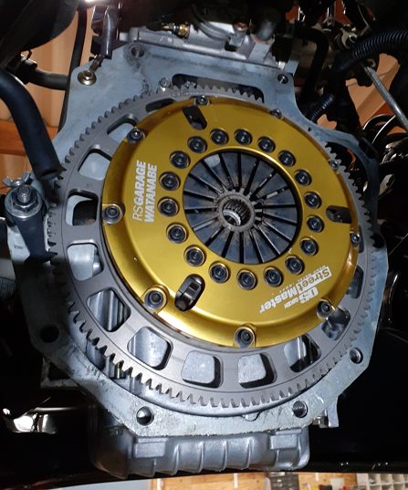 私のようにセッティングが出ていない、始動性が悪いクルマはスターターがフライホイールを「押す時間」が長くなります。それはフライホイールの歯にかなり負担を掛けます。社外品はクロモリの削り出しが多いと思いますが……強度的には足りないのカモですね。純正品ってここの歯だけで別なんですよ、実は。だけど純正品はめちゃ重いので使う気にはならず……まぁこういうリスクも知った上で使っているので特にどうこう言うつもりは無いですよ。
