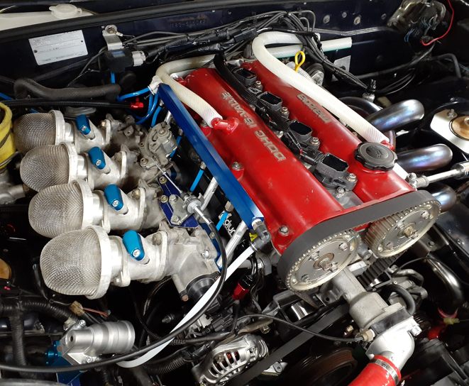 このエンジン……25年ブリくらいに見ました。実は昔のCⅡエンジンです、ジムカーナの改造クラスの。トダレーシングが作ったエンジンなんですよ。長年眠っていたのを起こした人たちがいるんです、凄いなぁ~