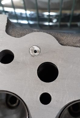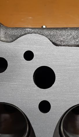 真ん中の上の穴に何か入ってるじゃないですか?あそこはオイルの通路でしてオイルポンプで出されたオイルがヘッドへ向かう道なんです。入っている物体はオリフィス。つまり通路を制限してヘッドに上がるオイル量を調節しています。