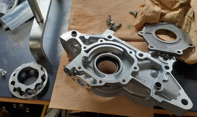 オイルポンプにも手を入れます、いわゆるリリーフ圧を上げるのに1ミリワッシャ。自分には2ミリ入れますけど……まぁそこまでしなくても良いかなと。多少リスクもあるので。恐らくこれで踏んで5キロくらい掛かると思います。私のは6キロ掛かりますけど(笑)