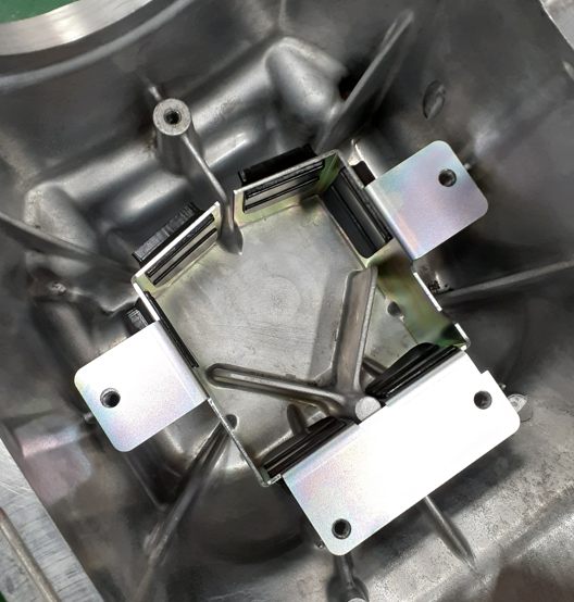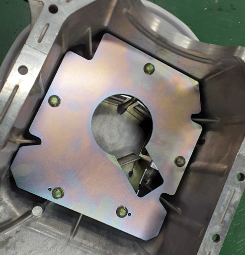 当店オリジナルのバッフルプレートですがこの上にフタをします、止めるボルトは5本、でも1本だけ「鉄板が1枚」になります。まぁそのまま締めこんでも大丈夫でしょうけど……私は1枚ワッシャーを入れています。