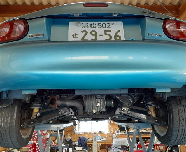 もうね……ウケました~ 元オーナーさんはこのNBから別のNBに乗り換えだそうで必要なパーツは移植したみたいなんですよね。ロールバーとか……まさかマフラーが無いとは思いませんでした。倉庫に純正のくたびれた奴があるので問題無いですけどね。