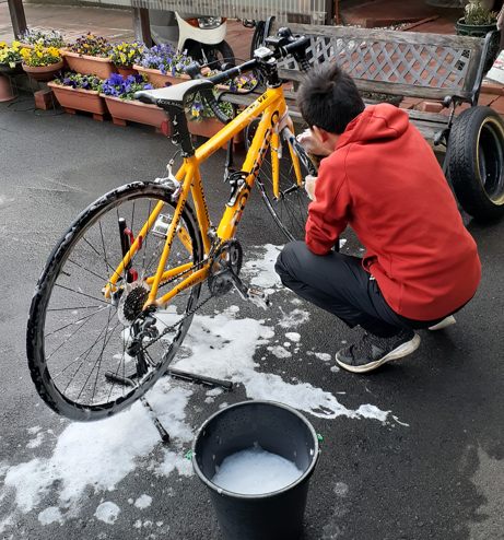 ヒマそうな長男坊に「チャリでも洗えば?」と。