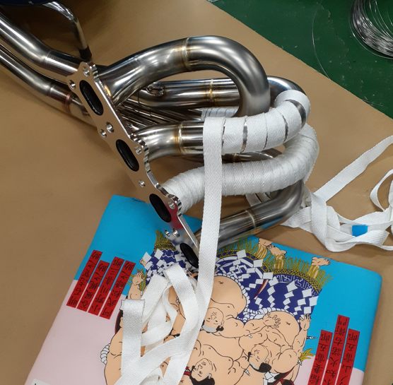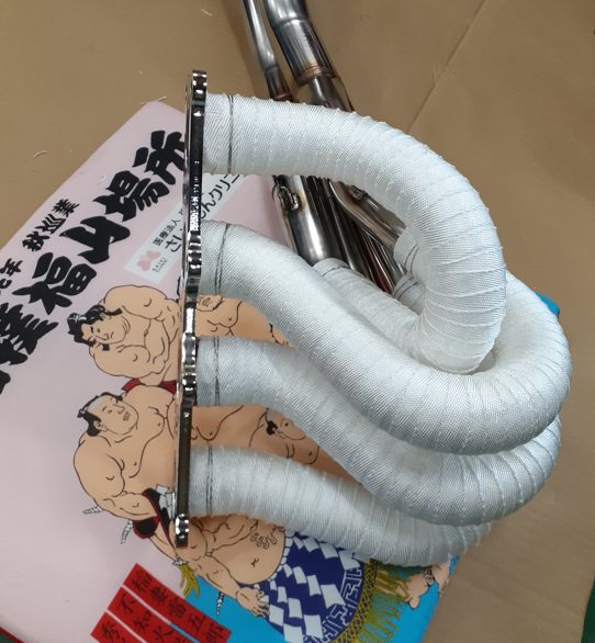 バンテージは1本7Mくらい巻いてます、それが4本、28Mね。ほぼ30Mかな?こんなにギチギチに巻かれたエキマニは見たことないけど(微笑) これだけ巻く理由は長持ちさせるためです。粗い間隔で巻くとすぐにダメになるんですよ。