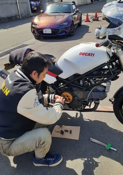 時間通り8時半にエキマニを取りに来たW氏、早速取り付け作業に入るのかな?楽しそうでした(微笑)