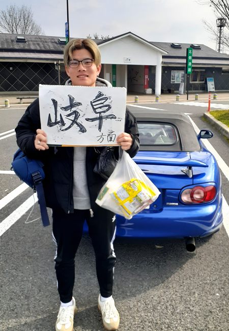 今まで乗せたことは無いんですがいつか乗せて見たかったんですよ、ヒッチハイカーを。「岐阜」と言うボードを持っていたのでちょうど良いし。