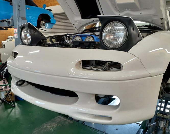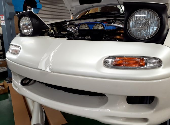フロントバンパーも交換します。ずっと持っていたHKS関西のモノに!