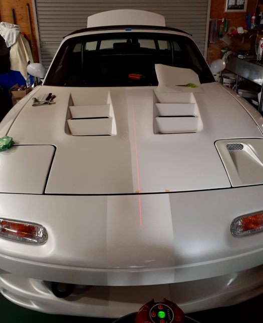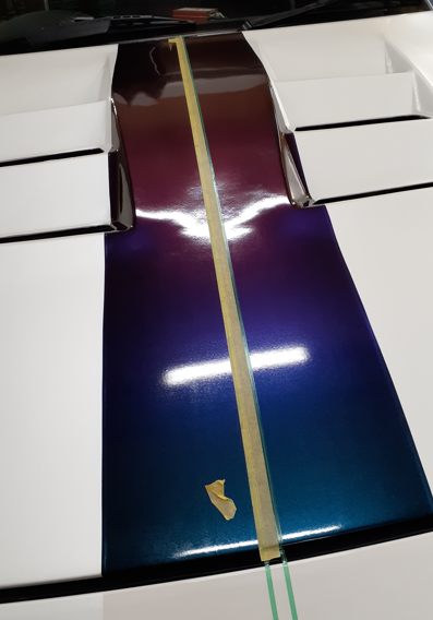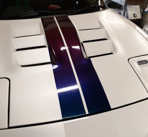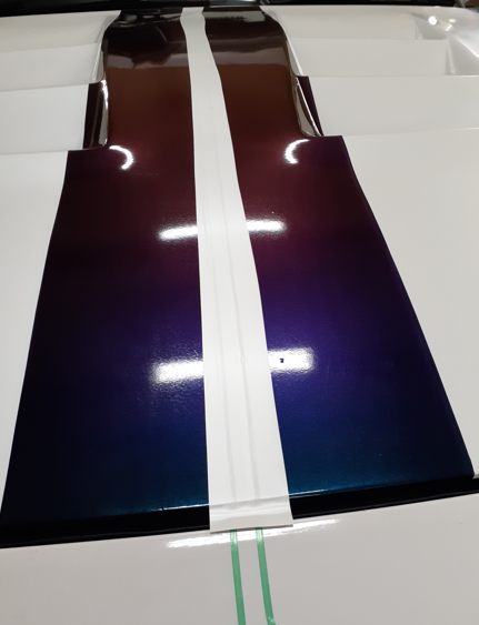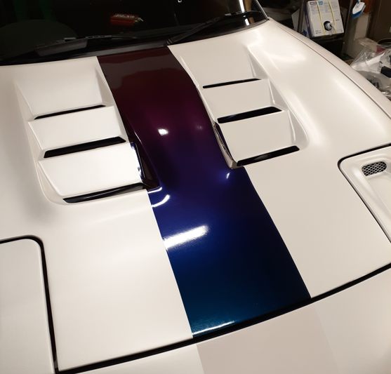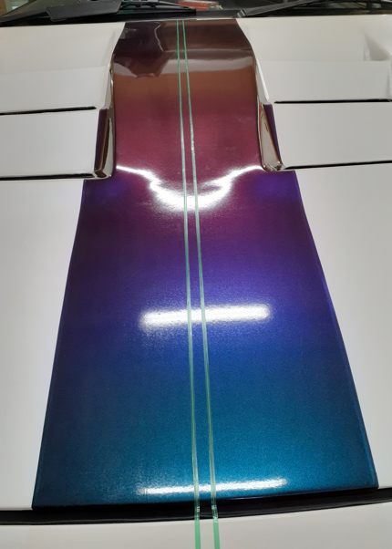これが完成図。フェンダはまだ貼ってないです。さてセンターラインを何色にするべきか? 手持ちのシートから選びます。今回のラッピングはすべて在庫のシートで貼ります、コスト削減というか不良在庫なので(苦笑)
