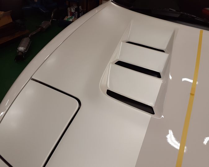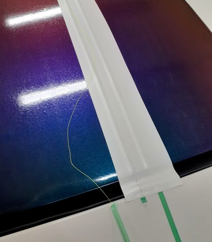 ボンネットをラッピングします。中央付近はラインを入れるので大雑把な形でスタート。エアダクト部分はシートを温めながら伸ばして張り込みます。多分……そのうち浮き上がりそう(笑) そしたらこのダクト部分だけ張り直そうかなと。そういうことが出来るのがラッピングの利点のひとつかと。塗装の塗り直しは大変ですがラッピングの一部貼り直しは簡単なんですよ。