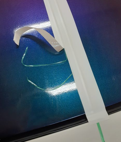 このように糸で切ります。カッターナイフは使わないのでボディに傷が入りません。ナイフが要らないという意味で「ナイフレステープ」と言います。