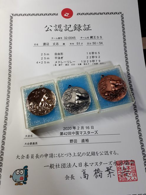 そうそう、スイミングの時に先日の大会の記録証を頂きました。