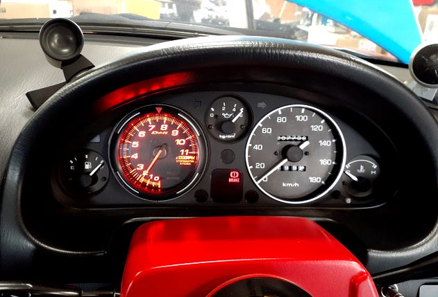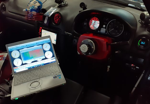 このクルマ、NAなのにダッシュはNB、メーターはNAだね……ややこしい(笑) 制御は私と同じフルコン(メガスク)が搭載されているのでセッティングしようと思ったら……