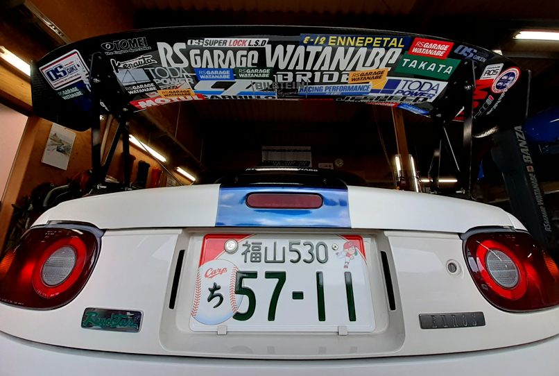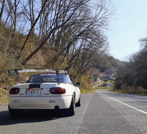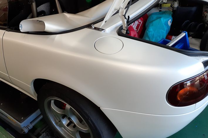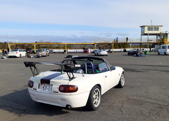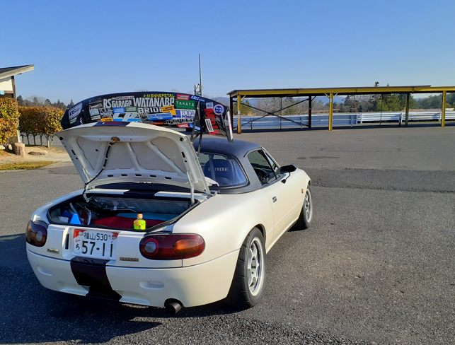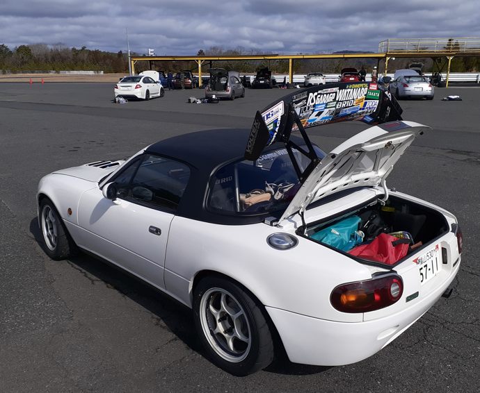前回走行してから考えた対応策は……軽量化とリアウィング装着。なので幌を撤去、移動はハードトップ。助手席も走る時に外す。そしてリアウィングの装着。