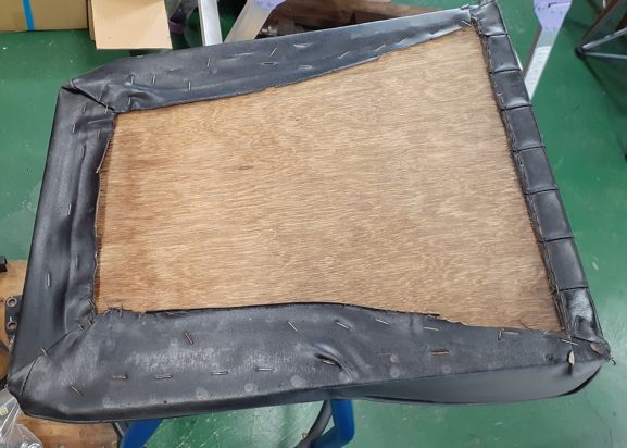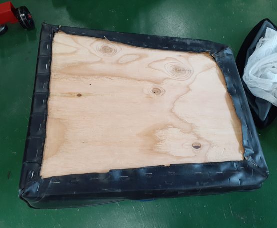 めくってみると……超薄いスポンジ(笑) こりゃ座り心地悪いわけだわ……もういっそのこと、スポンジを張り替えよう。