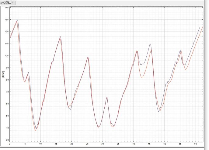 赤が前回、黒が今回。ほとんど一緒です、加速も減速も。違うのは「新コーナー入口」の処理。その差がタイム差でした。