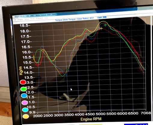 予想よりは良いかな……ただね……トルク(左の画面)で凄い谷があるでしょ? ここはAF計で「リッチ」(笑) それ以外は全域AFが10台なんです! ありえない!(笑) まるでターボ車の燃調か? NAなら前半13台、後半12台くらいにします。10台はありえないくらい濃いんです。これじゃパワー出ませんて。