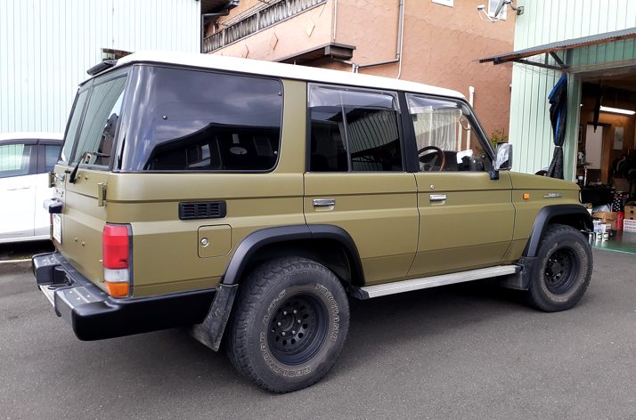 白いルーフは何もせず。ボディをカーキ色、フェンダを黒。リアのバンパーもメッキ以外は黒に。なかなか精悍な感じ。好きなヒトは好きなんでしょうね~この型が。私は全然興味無いけど(笑) 大味すぎる、色んな意味で。運転を楽しむ……とは対極なクルマですから~ 小さい車が合うんでしょうね、私には。
