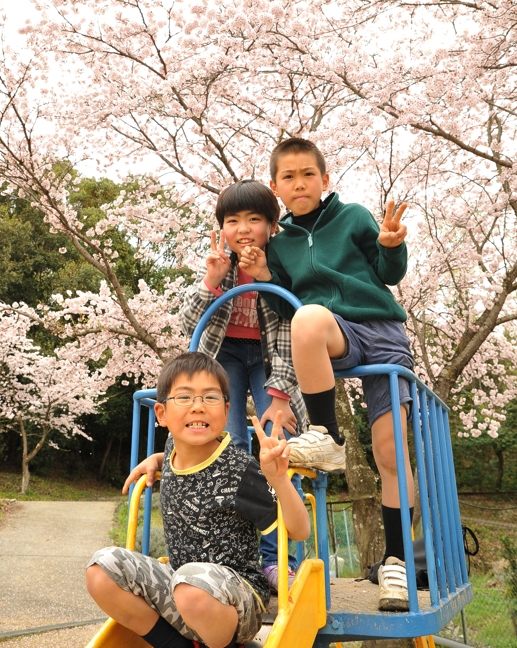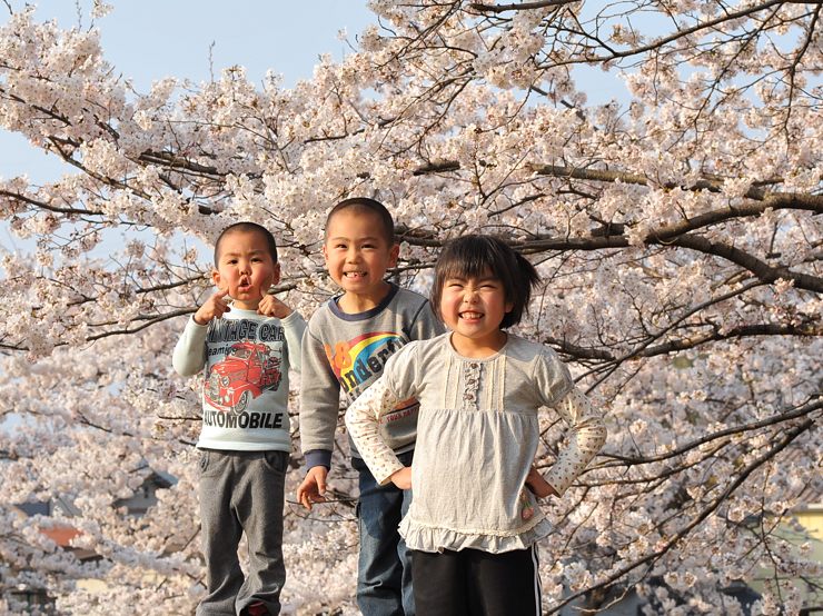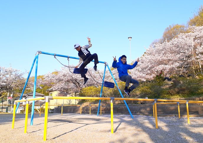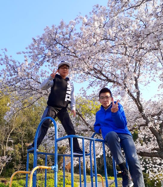 町内の公園の桜が見頃だよね……毎年、子供たちと写真を撮っています。
