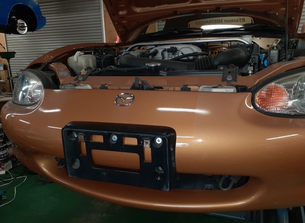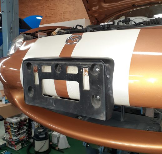 ナンバープレートのホルダーはリベット止め……リベットを外すと……あ、バンパーの裏にアテものをしないとリベットできないし! バンパー脱着です……サービスです……