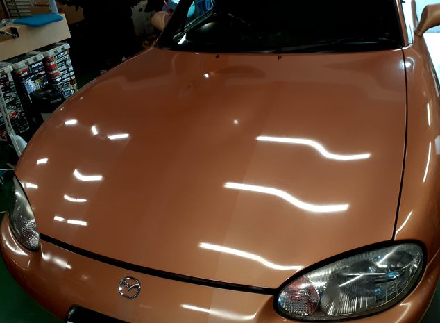 2015年にウチの代車号だったNBです、今は別のオーナーさんが所有中。私が施工したレーシングストライプのラッピング、画像ではわかりにくいですがシミも酷いので剥がしましょうということで……(剥がす作業はサービスです、私が貼ったので)