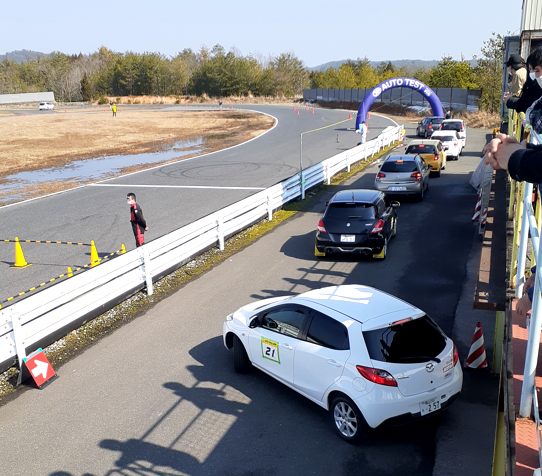 21番が奥さんのデミオ!練習走行ではミスコース(笑) 練習走行では全車の半数がミスコースでした(爆) え?あの簡単な設定を間違えるの?と思ってしまいますが……未経験者で「イベントという緊張感」があると「頭が真っ白」になるのかも。