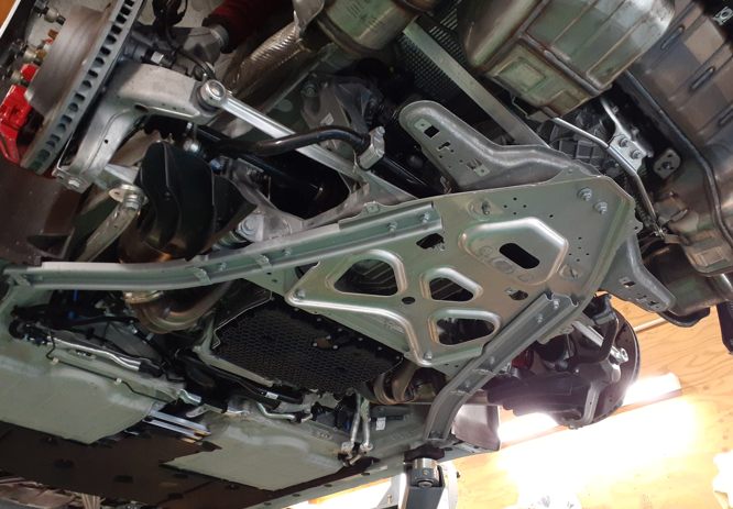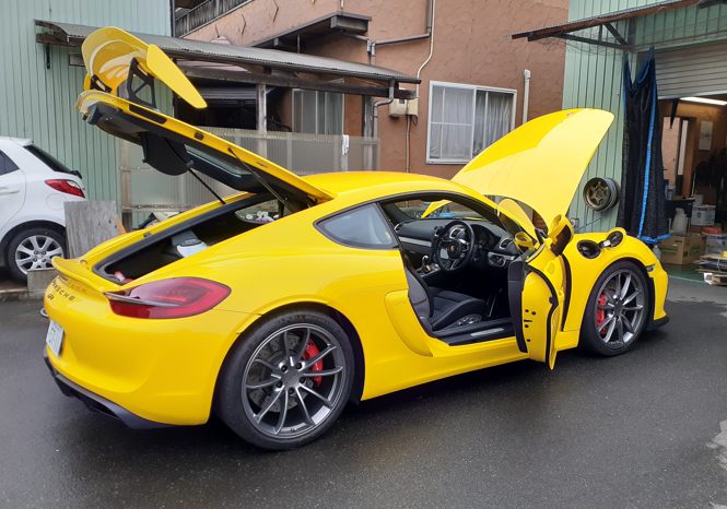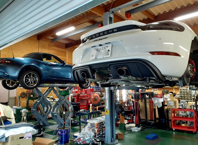 このクルマは近所の718スパイダーです!新車で購入後、最初のエンジンオイル交換を……とのことで来店。私のGTヨンと違いオイルパンがカバーに隠されていてこの状態にするのにひと手間。