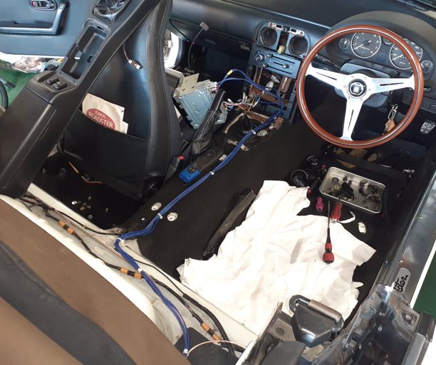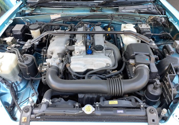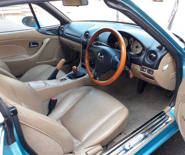 タイミングベルト一式、水回り一式、オイルパンのオイル漏れ修理、オルタ交換、オーナーさんが降りる1年前くらいの段階でヘッドライトや幌(貴重なNBビニールタンの新品!)は交換、6速MTも新品に交換済み。トダのフライホイールだし、マフラーはサクラム管。もうね、フツーに快適。マメなオイル交換をしてくれましたのでエンジンも絶好調です(点火系も交換済み)。