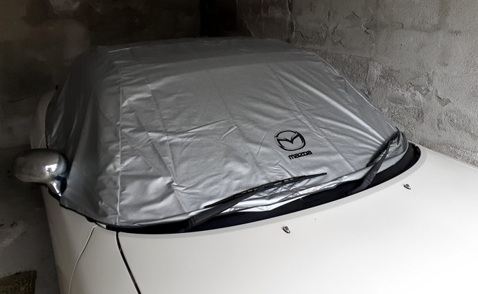 引き渡しまでもう少し時間のあるNA、お向かいさんの車庫に格納中ですが……ホコリ除けにハーフカバーを新調しました。私のですよ、オーナーさんのじゃ無い。当店での保管用にと思ってね。幌は新品だし。できるだけ綺麗な状態で引き渡ししたいですし。