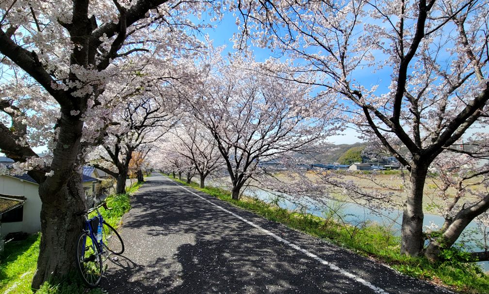 井原堤です、3キロくらいかな?ずっとこんな感じの桜並木なんです、感動的な美しさ。今回はちょうど満開です。花が散って葉っぱが出てくると……毛虫が大量にぶら下がりますのでここは走れません(笑)