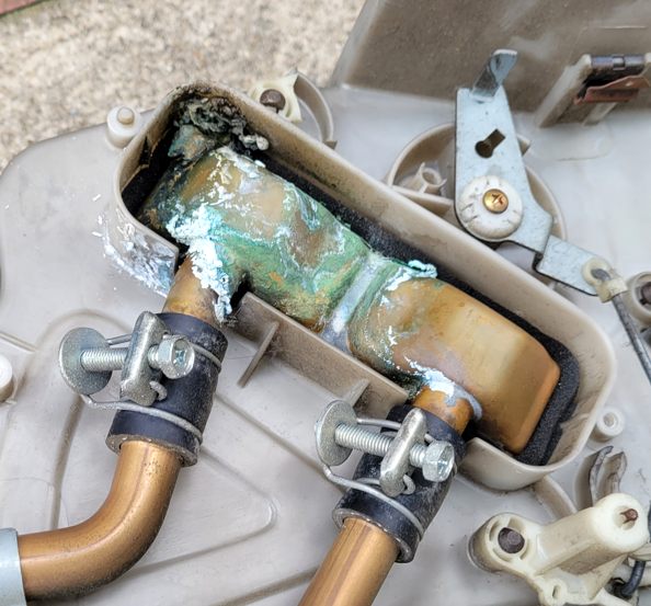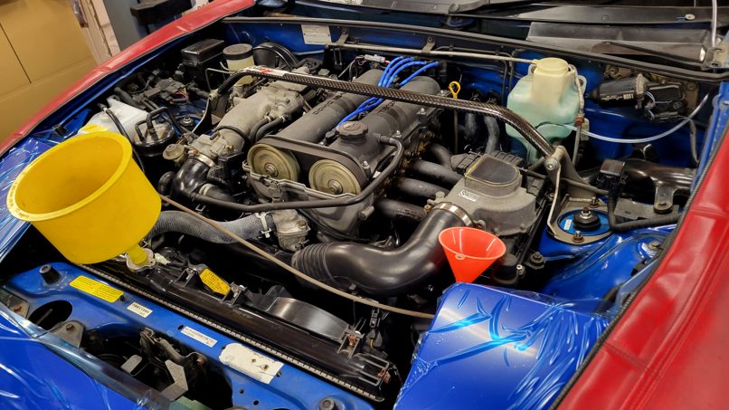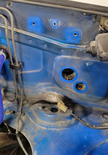 ドアを開けたらクーラントの匂いがしていたのです、まぁこうなってるよね。NAで未交換車は全滅ですよ。